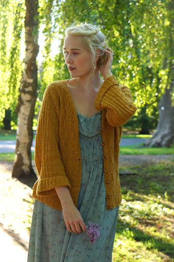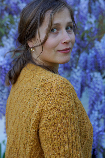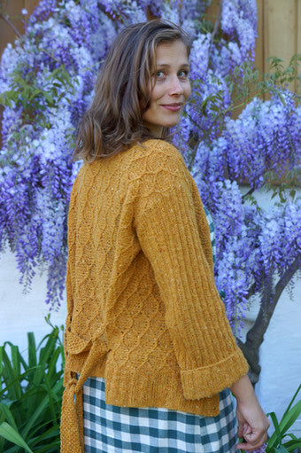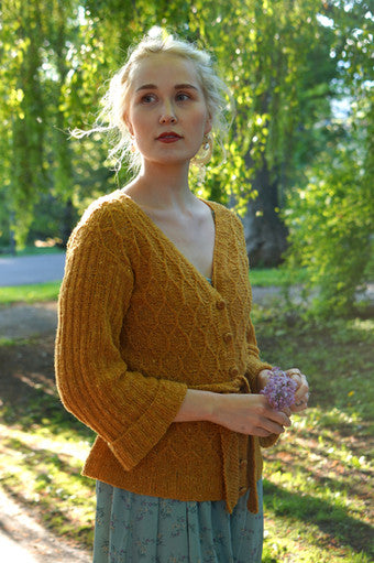 The Abeilles Cardigan is a rustic and romantic cardigan designed to be thrown over any outfit. It has a timeless honeycomb pattern, an elegant V-neck and is cinched with a belt at the waist