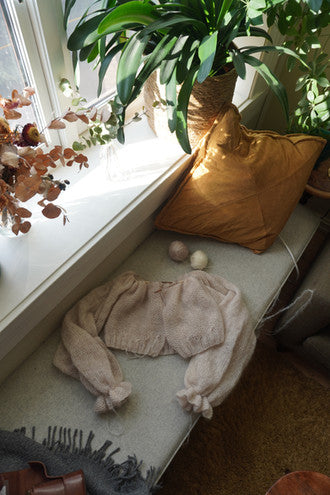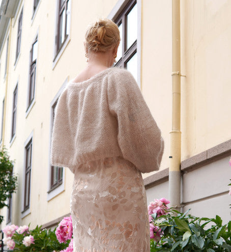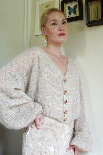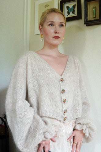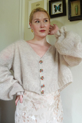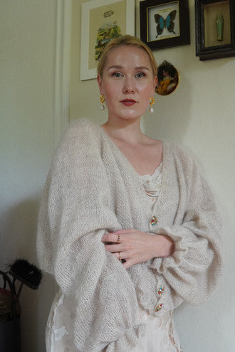 The Aerie Cardigan is a fluffy cardi worked in two strands luxurious mohair silk. The body is worked in seed stitch, and the stockinette sleeves have a feminine seed stitch ruffled cuff, working together with the cropped, oversized silhouette and V-neck shaping to create an elegant and feminine yet cozy and comfy knit. It is worked bottom up, and the sleeves are knit on using raglan.