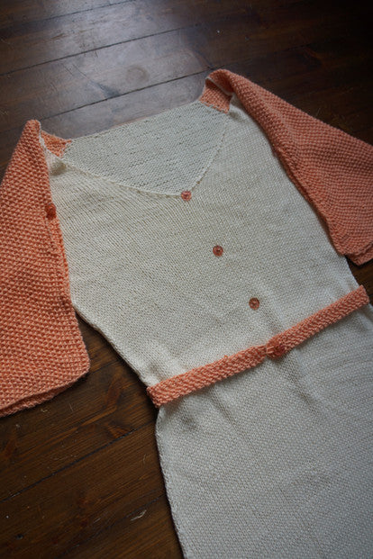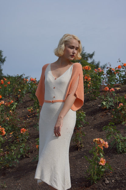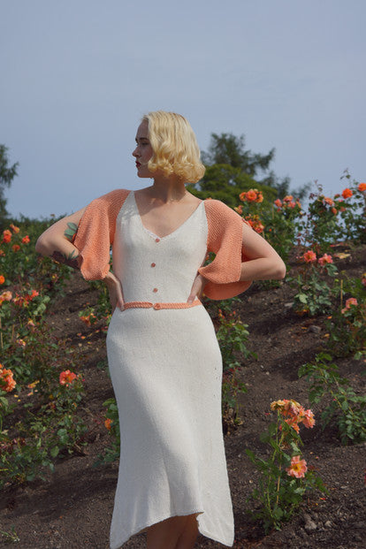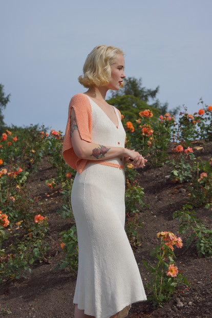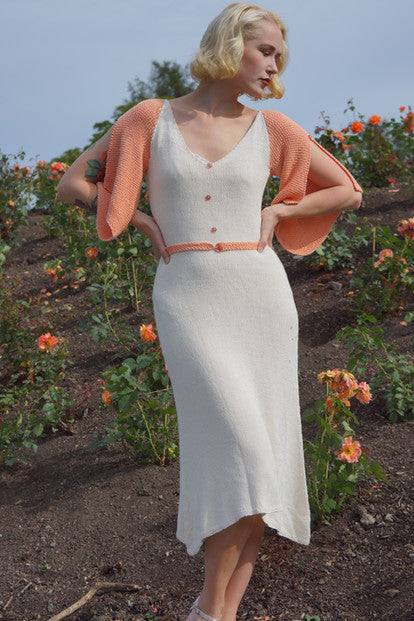 The Darjeeling Dress is a comfortable and pretty summer dress knit in soft, cooling bambooyarn. The silhuette is inspired by the feminine 1930s, and has split flutter-sleeves knit in a beautiful seedstitch, and a flattering v-neckline.