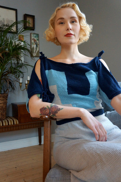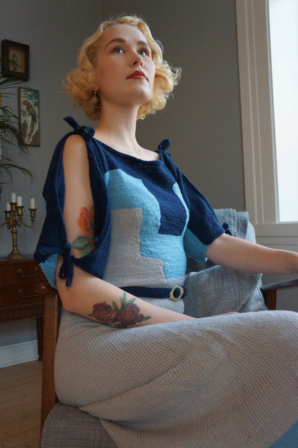 It has feminine open slit shoulders that tie at the shoulder and elbow, and an iconic Art Deco colourblock pattern of 3 colours. The dress has endless colourcombinations to fit all tastes and seasons.