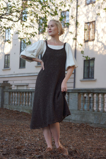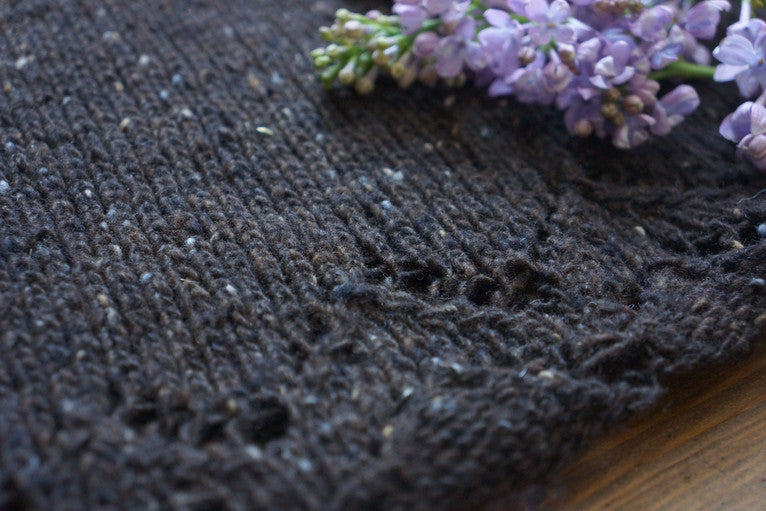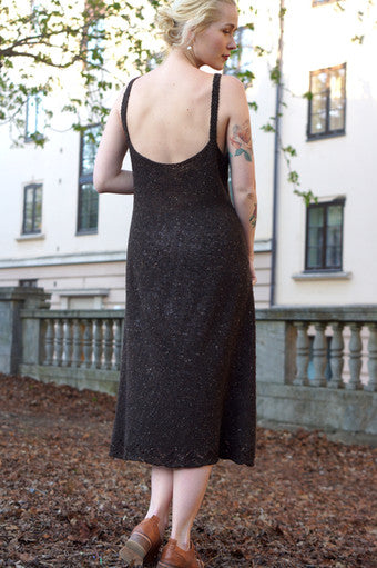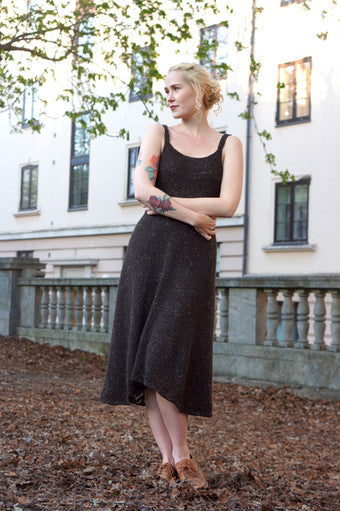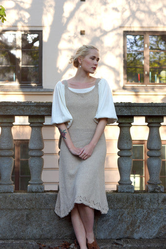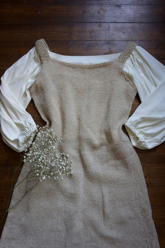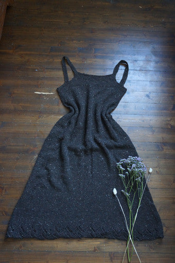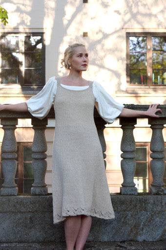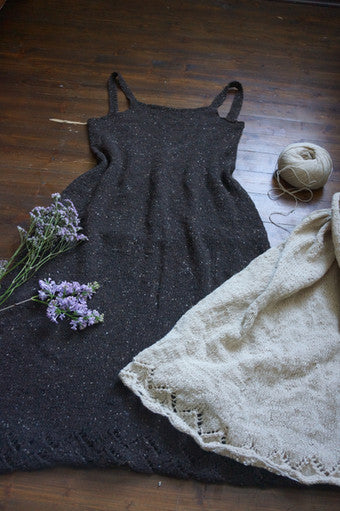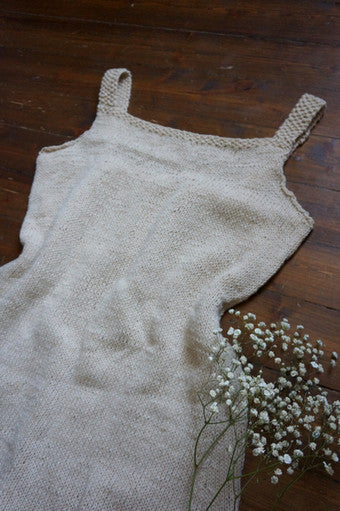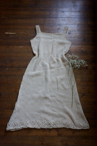 The Églantine dress is a simple, romantic dress knit from the bottom up, with a delicate lace pattern at the hem, and a flattering seed stitch neckline with straps. It’s perfect both on its own and worn with a blouse underneath