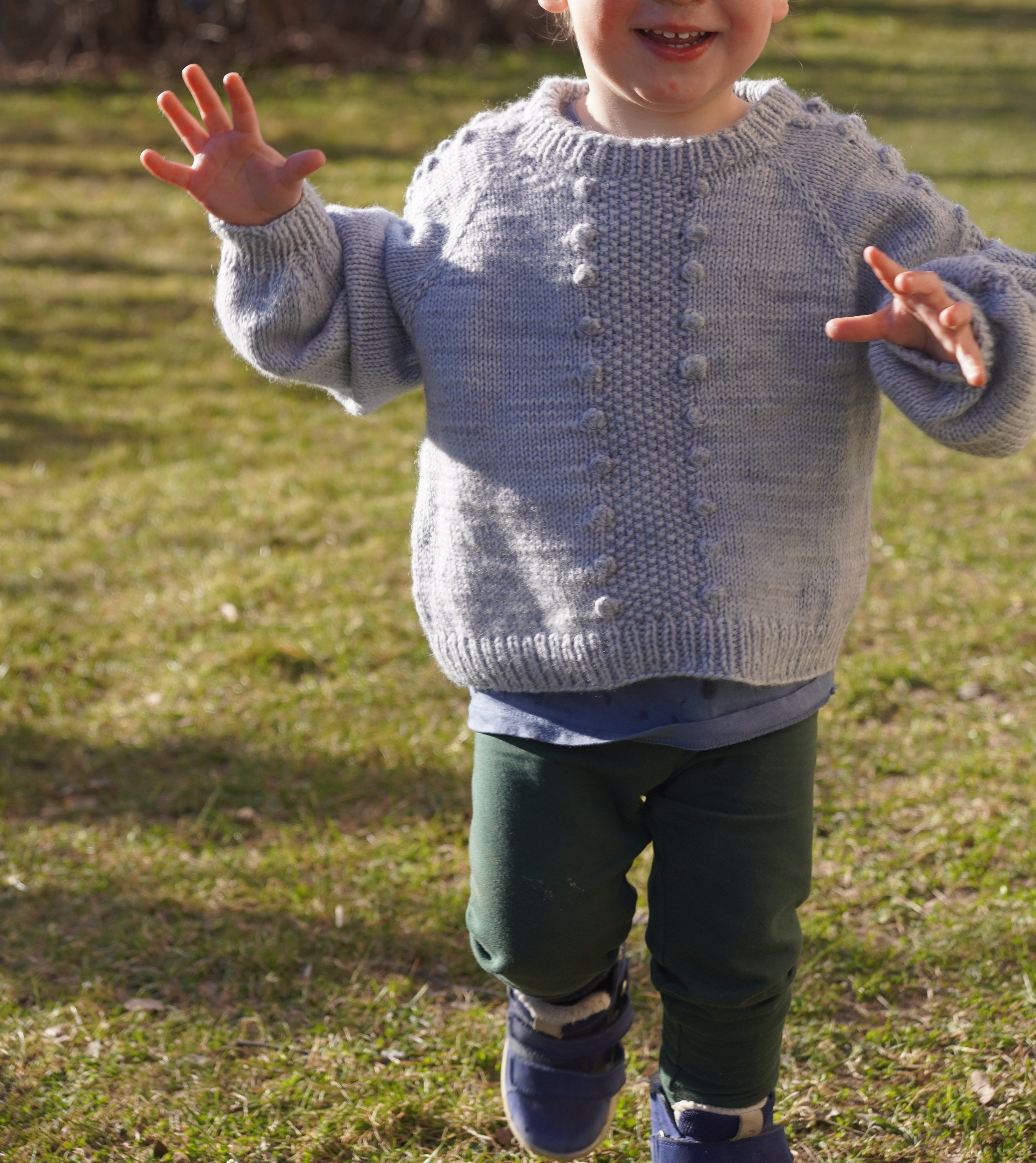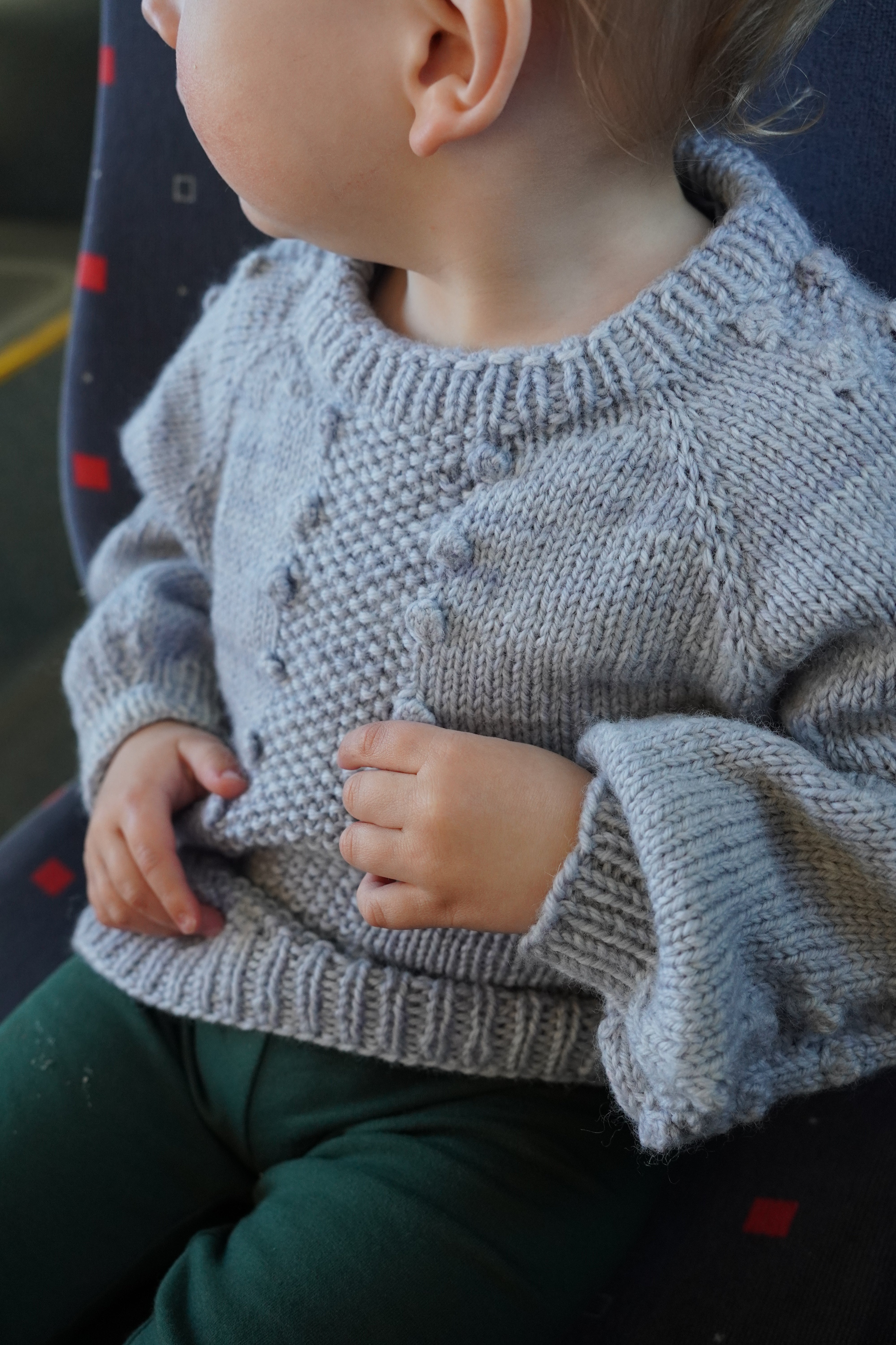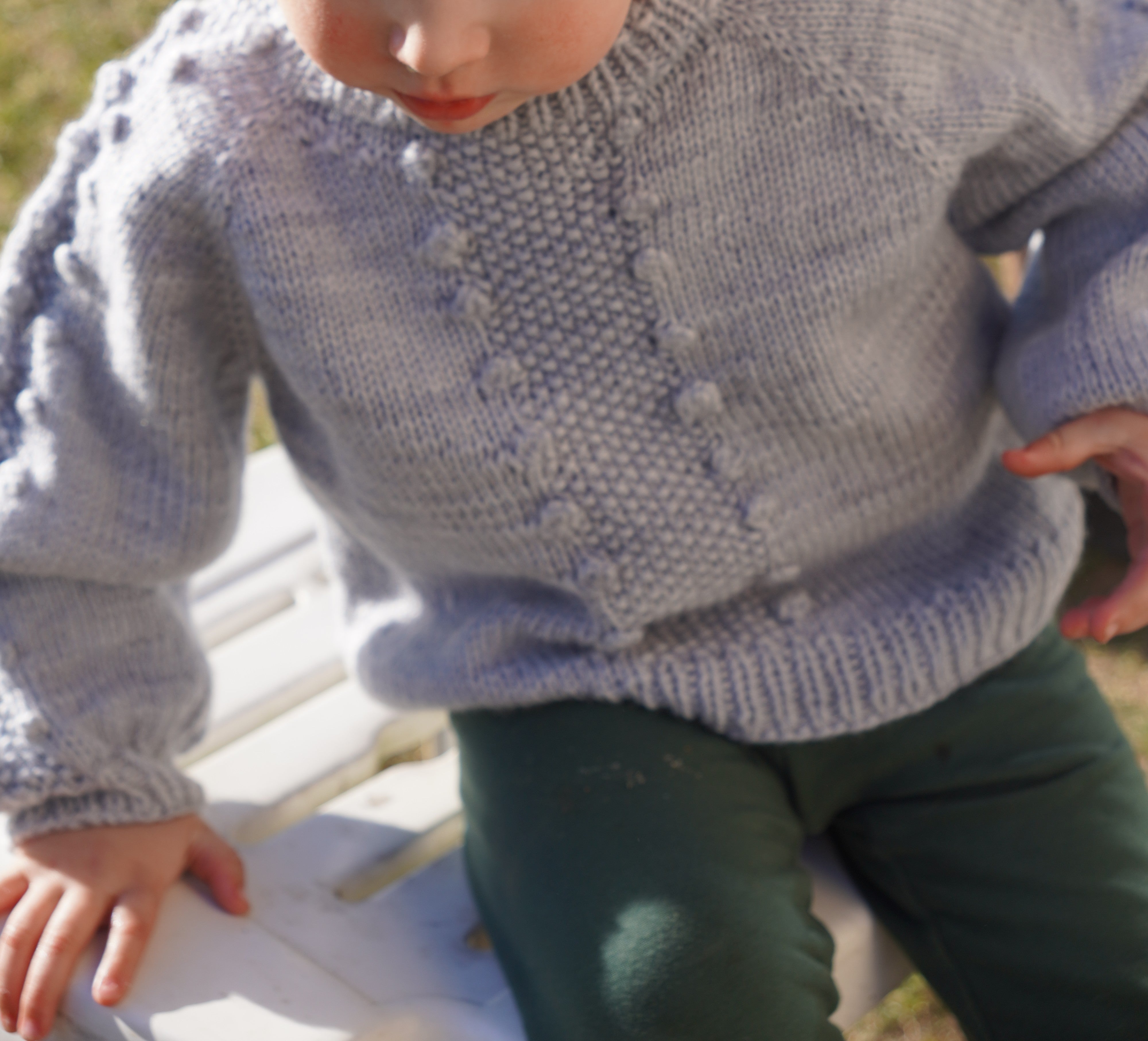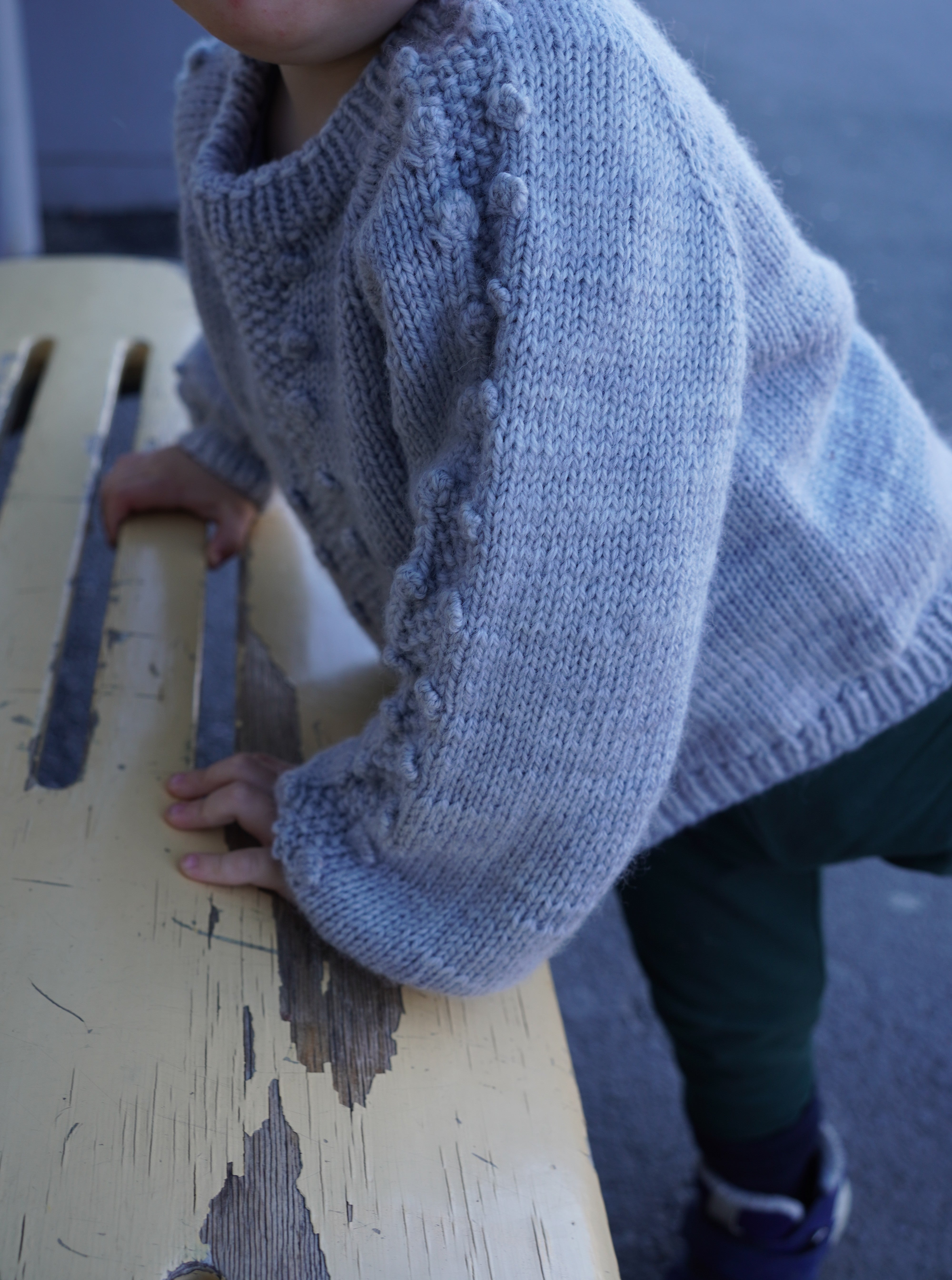 The jumper is worked top down with a cozy double neckline, raglan sleeves, and a combination of stockinette, seed stitch and bobbles for the body and sleeves.