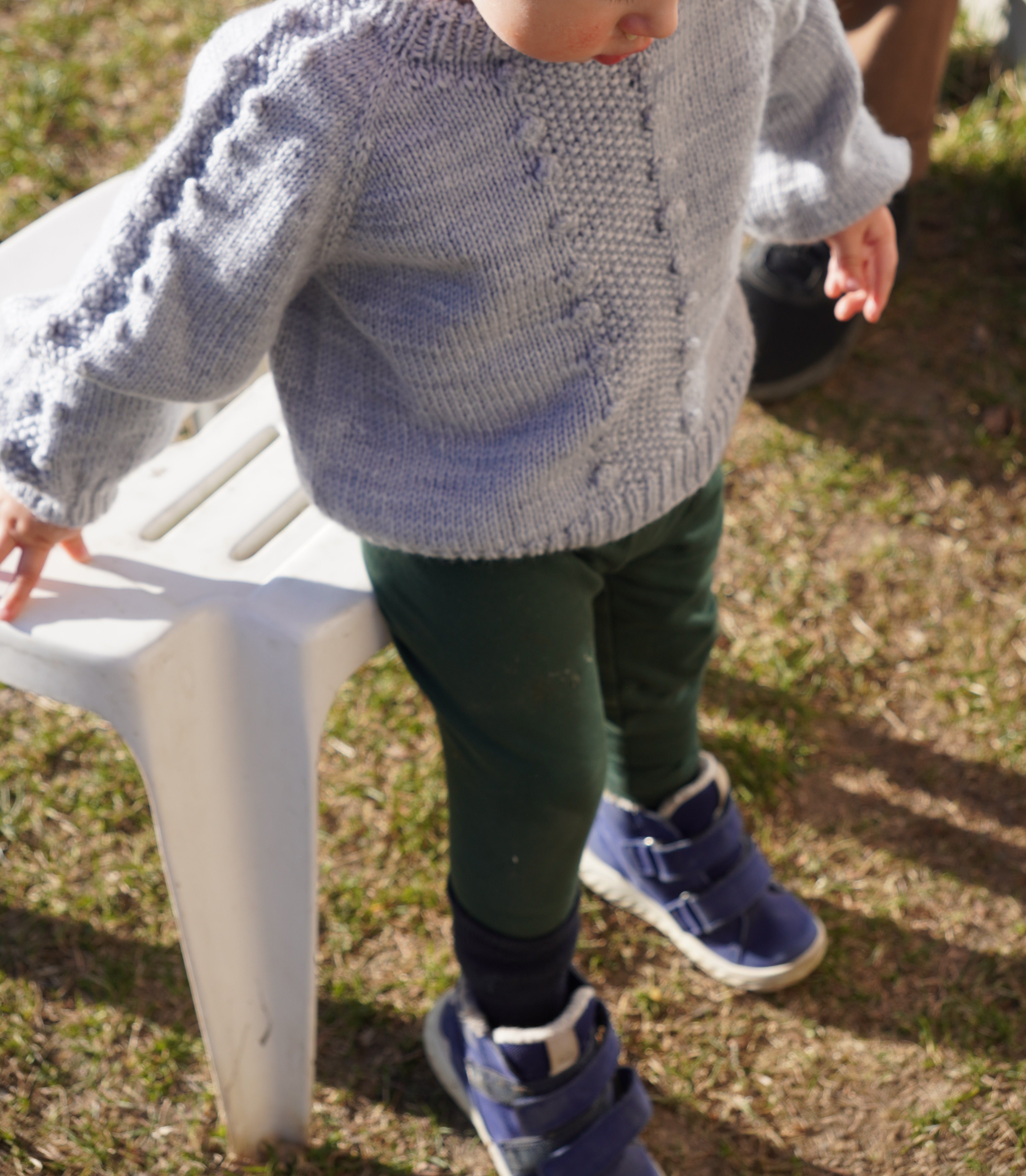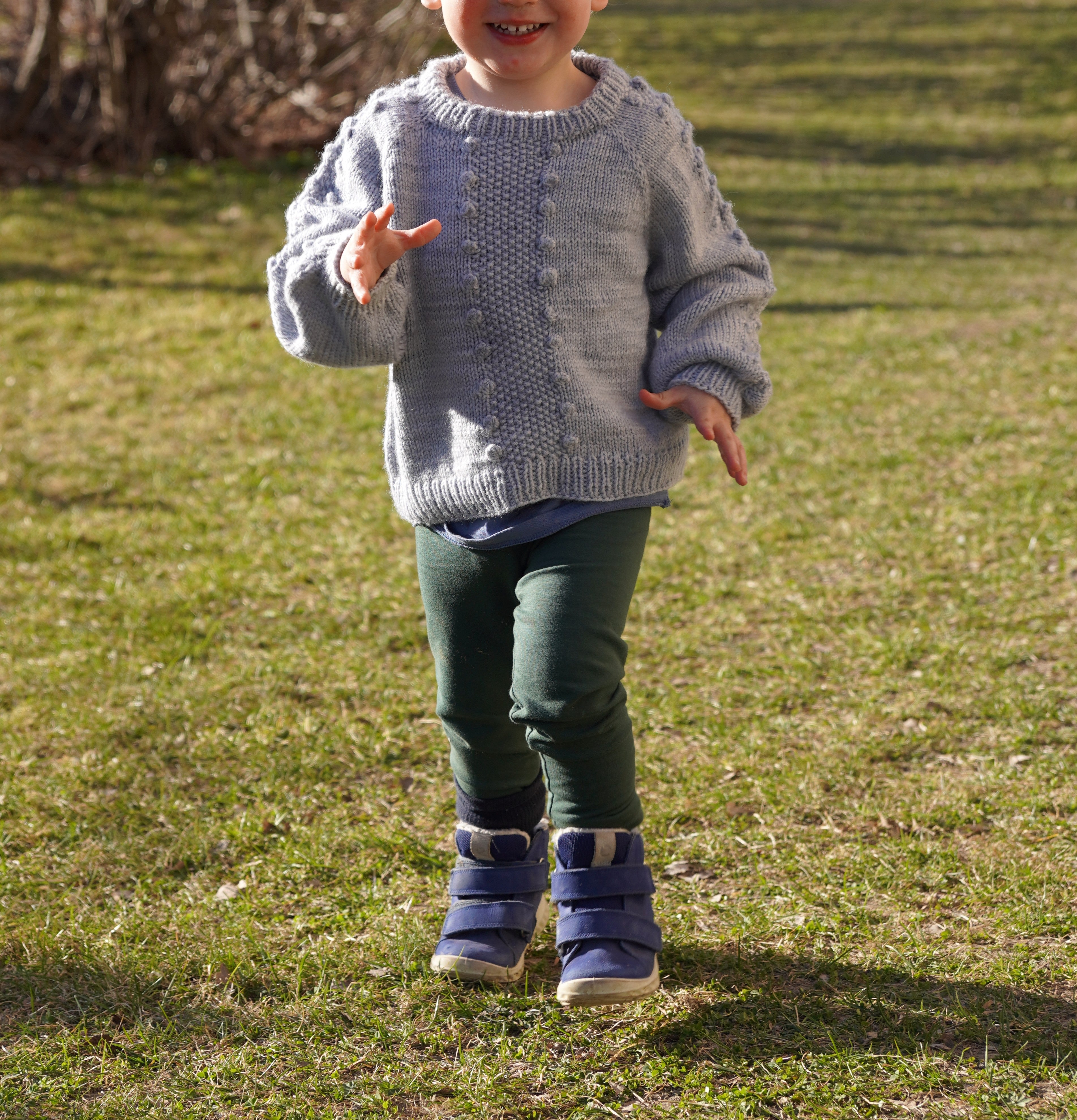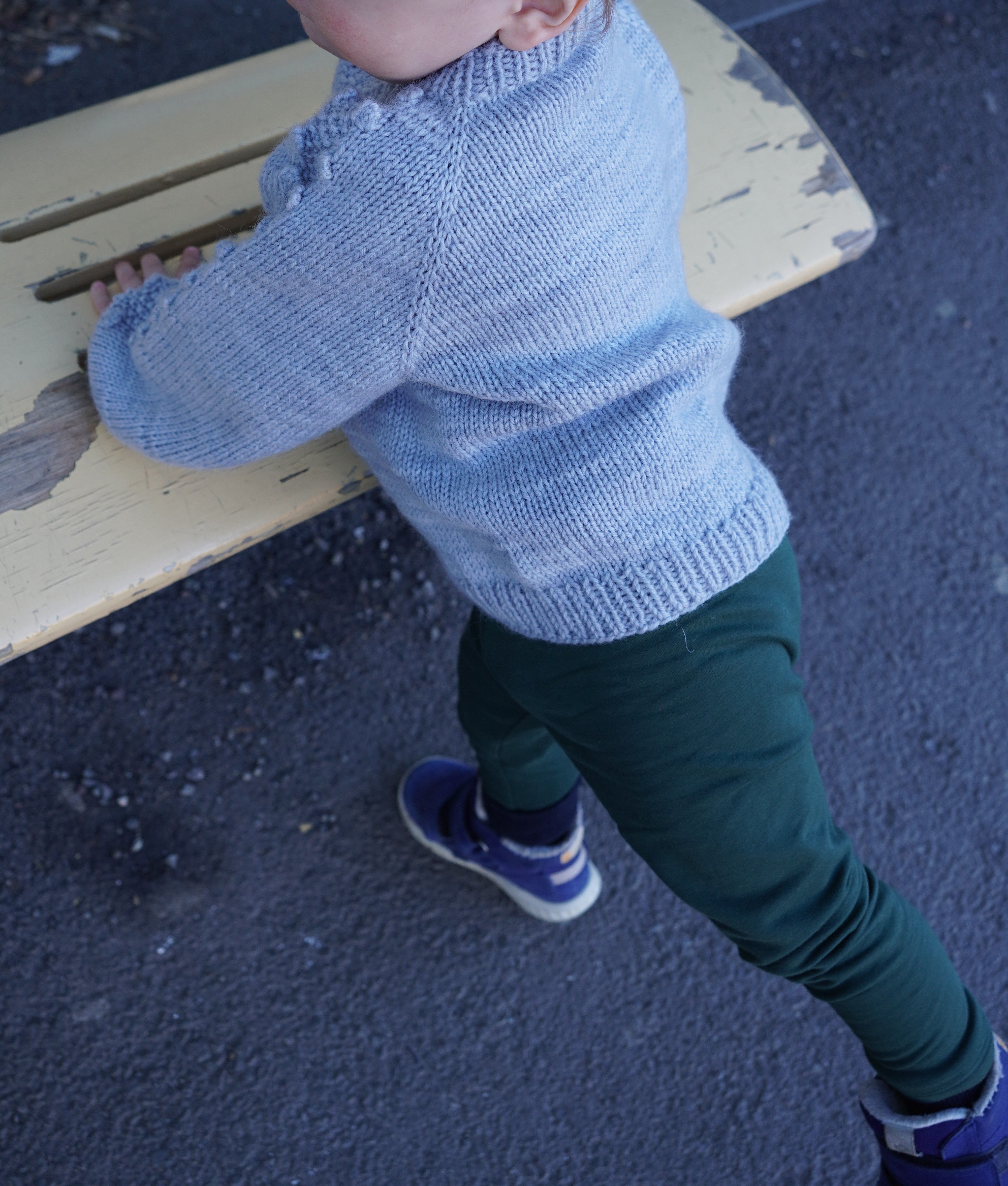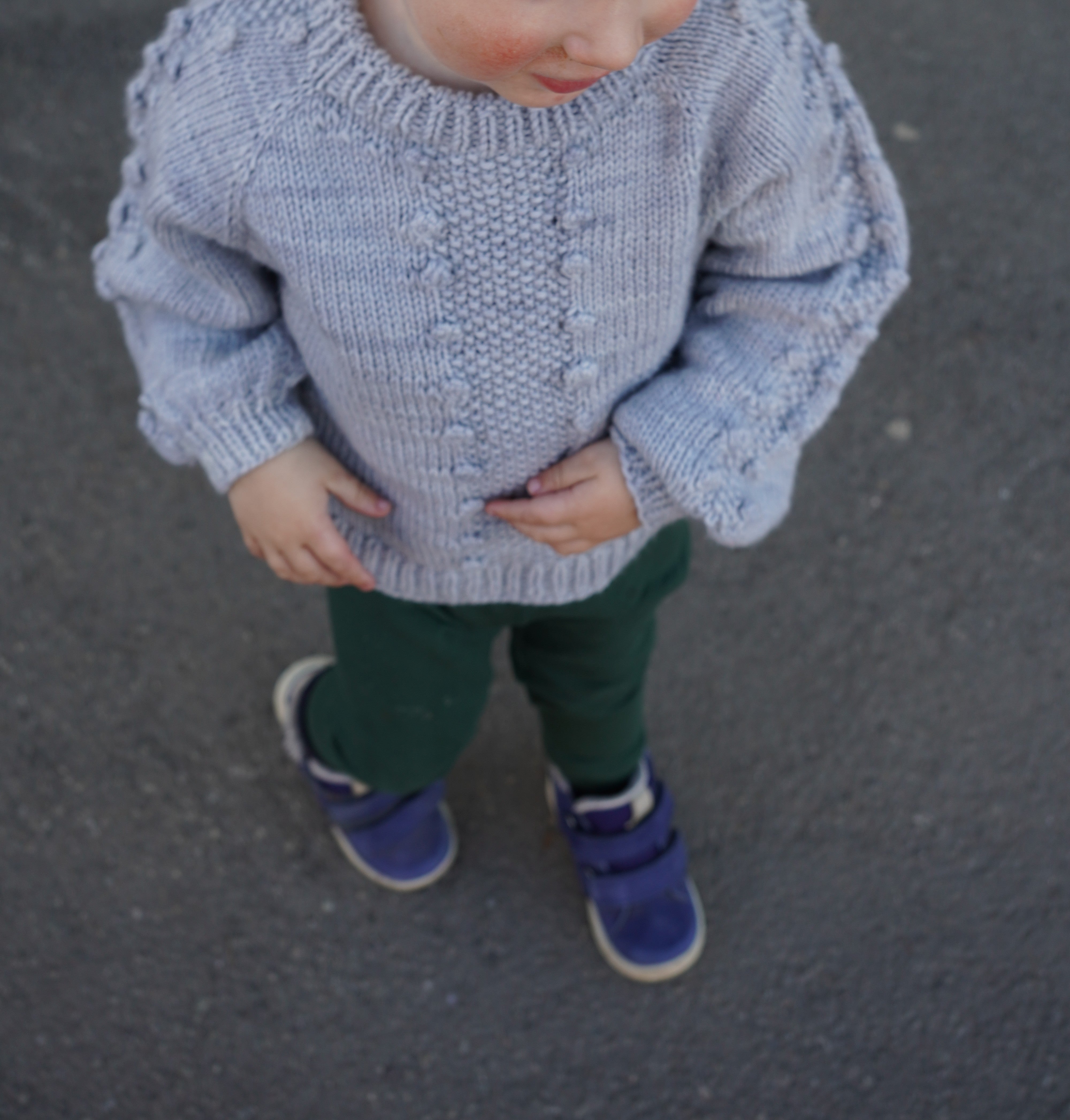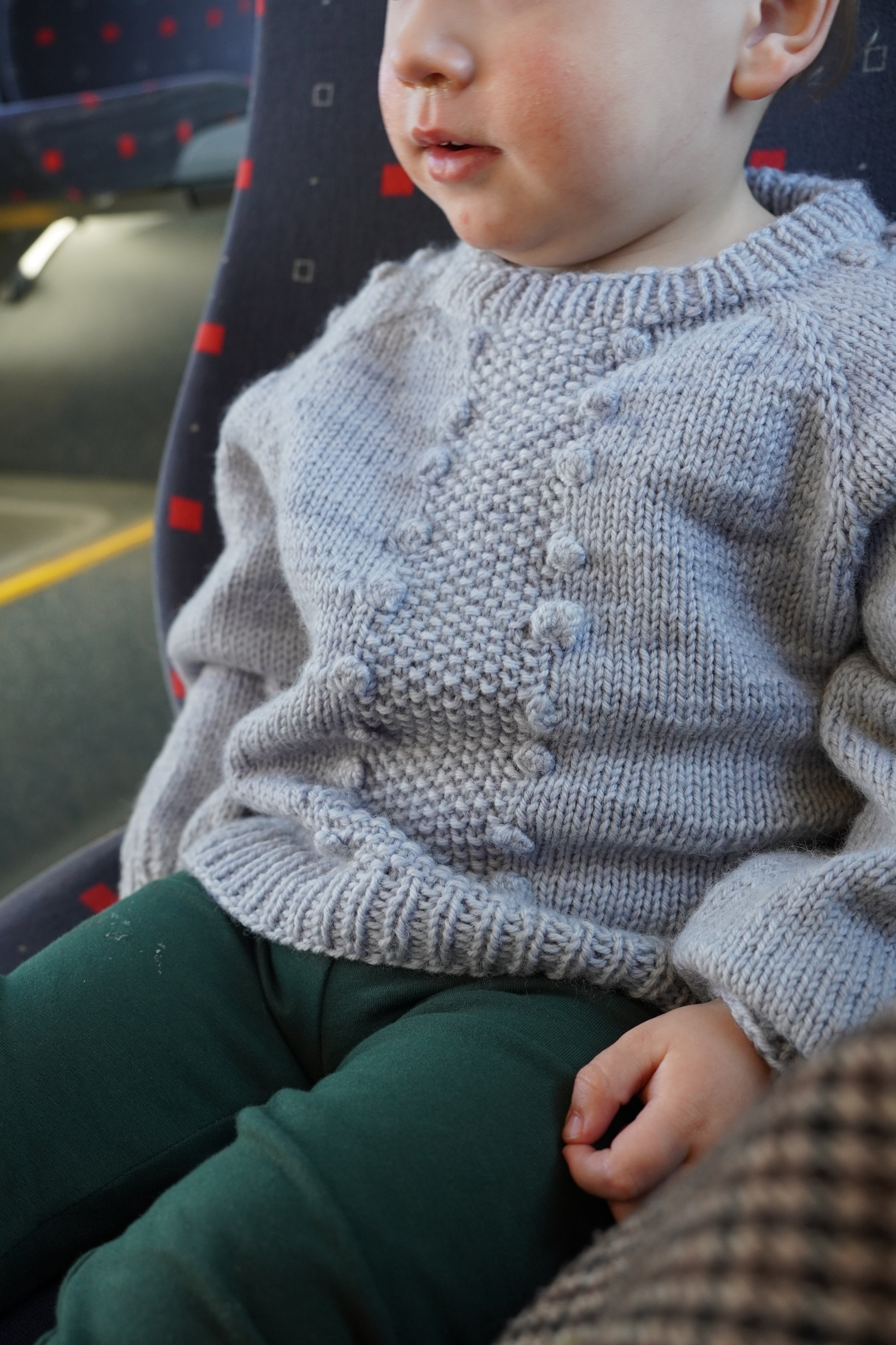 The jumper is worked top down with a cozy double neckline, raglan sleeves, and a combination of stockinette, seed stitch and bobbles for the body and sleeves.