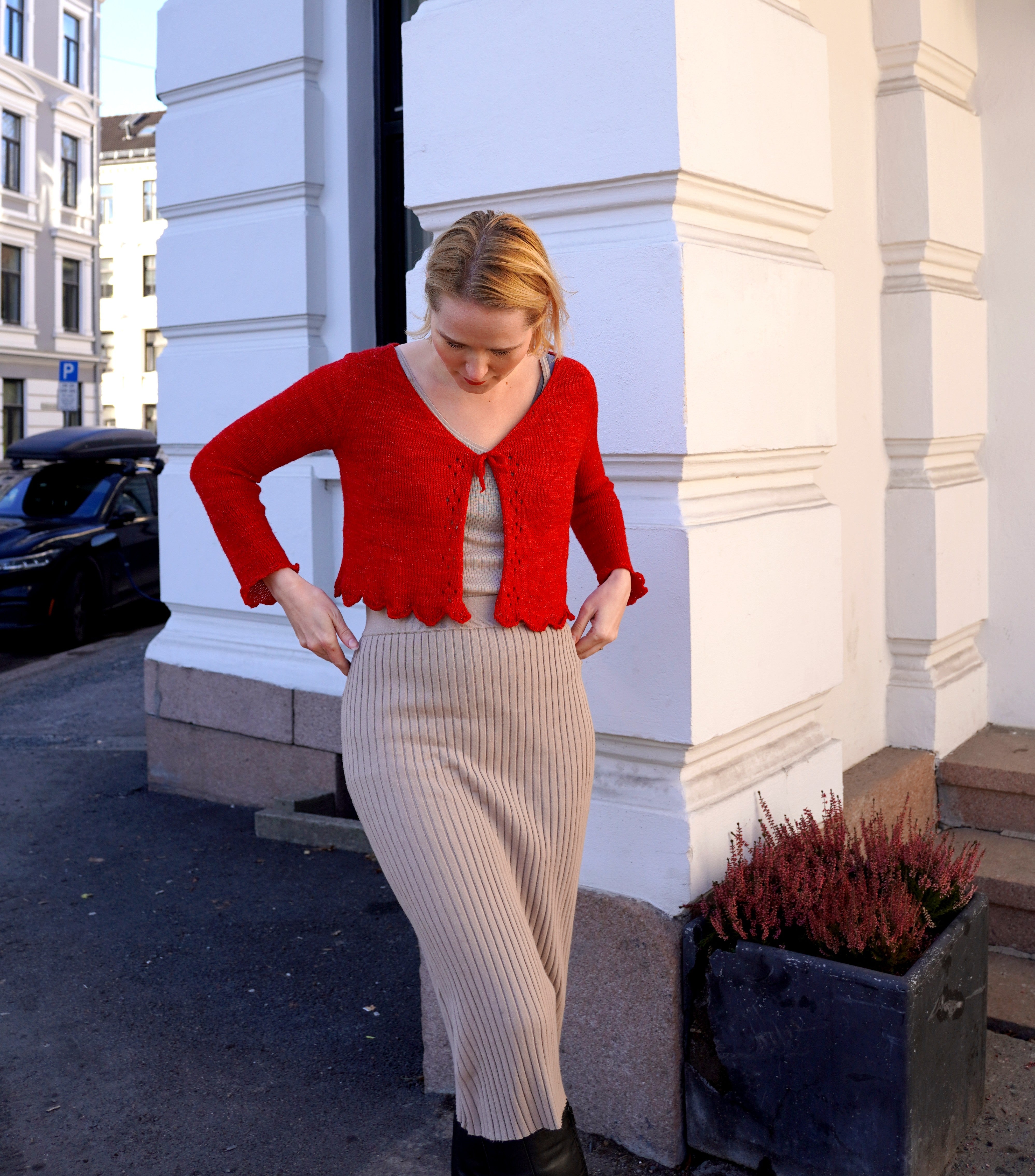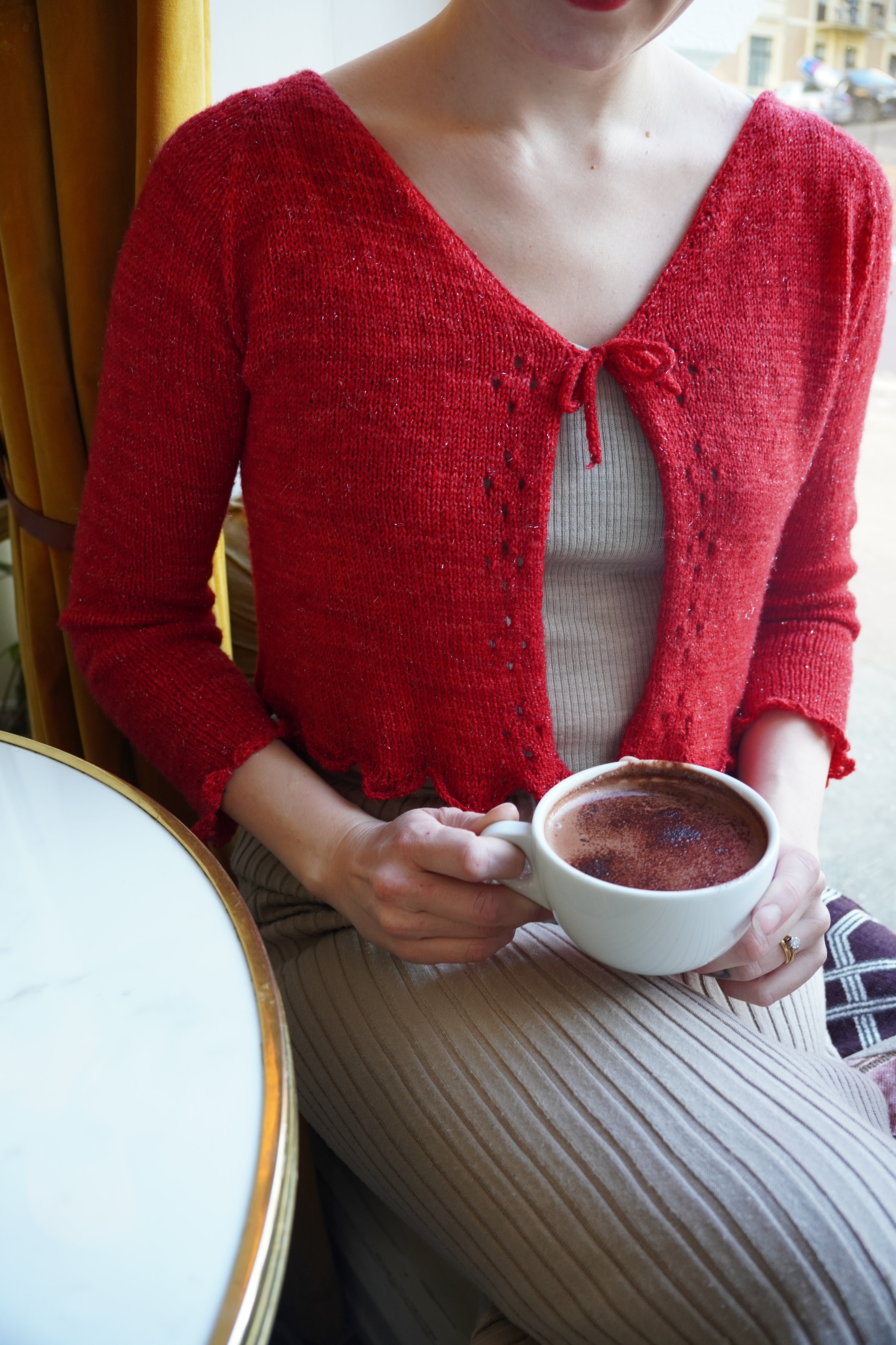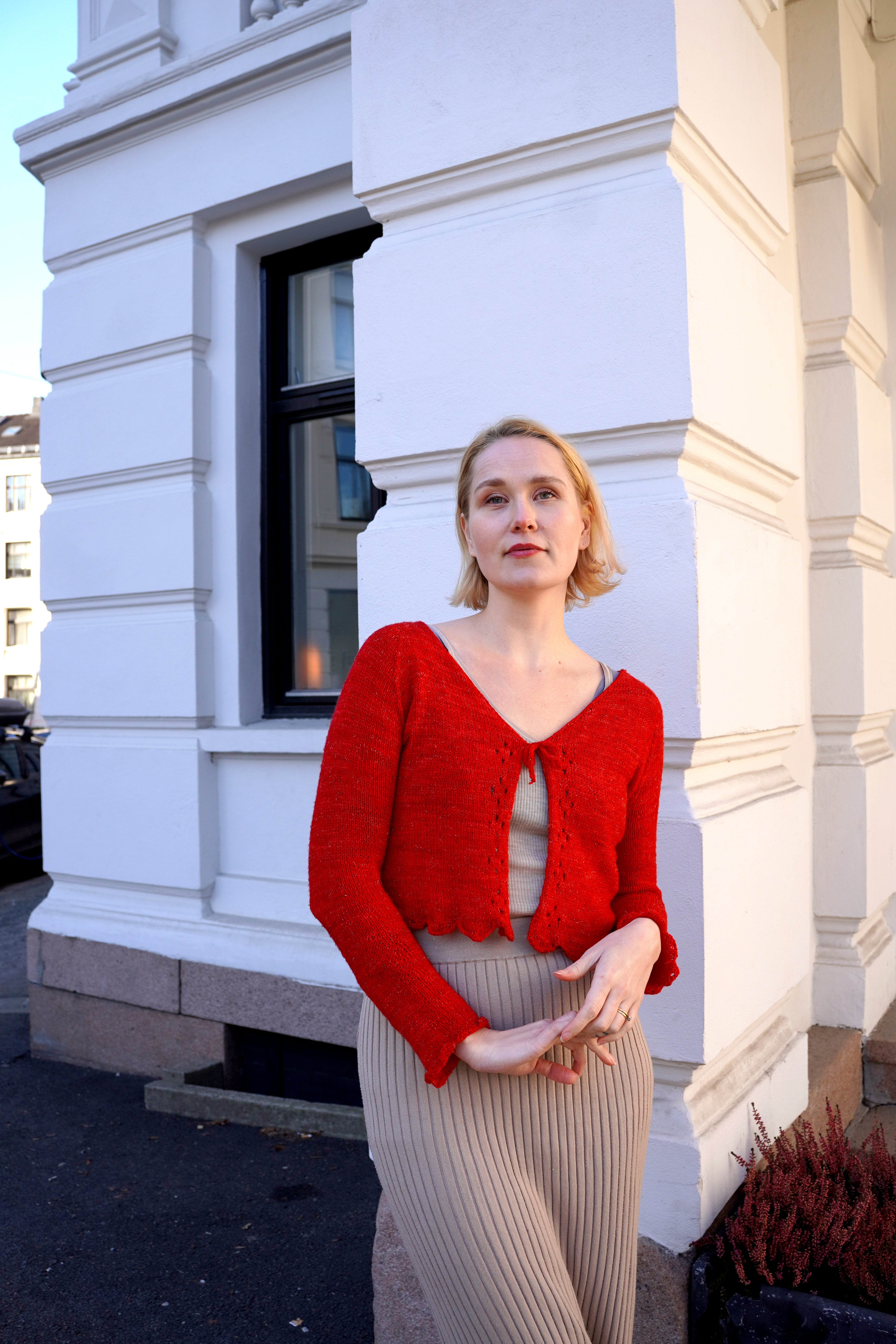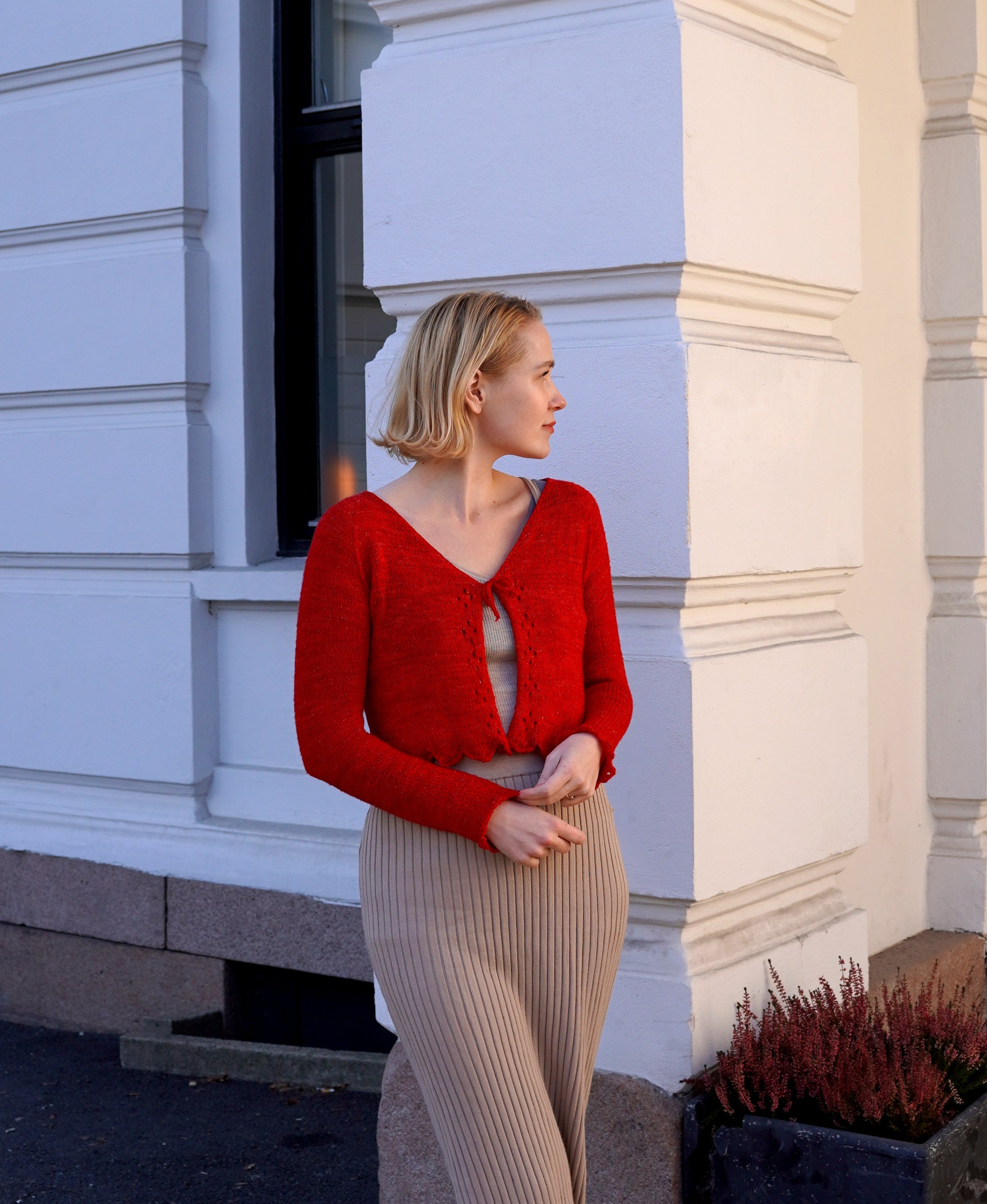 The Tulipan Cardigan is a simple and feminine cardigan with an i-cord tie over the bust, with a slightly flowing open body with simple lace details and a petal-hem. It is worked top down with raglan sleeves. Perfect over dresses!